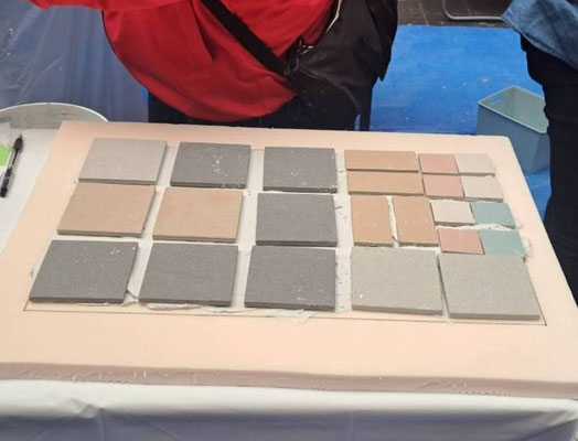 小手の使い方に戸惑いながらも、下地モルタルに見立てた紙粘土を丁寧に塗り広げ、それぞれが工夫を凝らしながらタイル貼りに取り組んでいました。